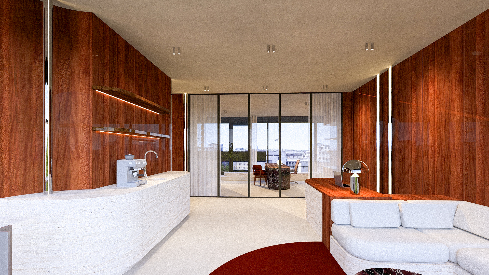 For Joybuy’s Paris headquarters, MWA chose to collaborate with NABS, who led the design of seven floors of workspace, terraces, and gardens—creating a refined blend of modern efficiency and Parisian elegance. The building’s bold 1970s geometries inspire the interior, where pallisander wood, red marble, travertine, and stainless steel come together with contemporary lines and soft detailing to craft a sophisticated yet welcoming atmosphere.