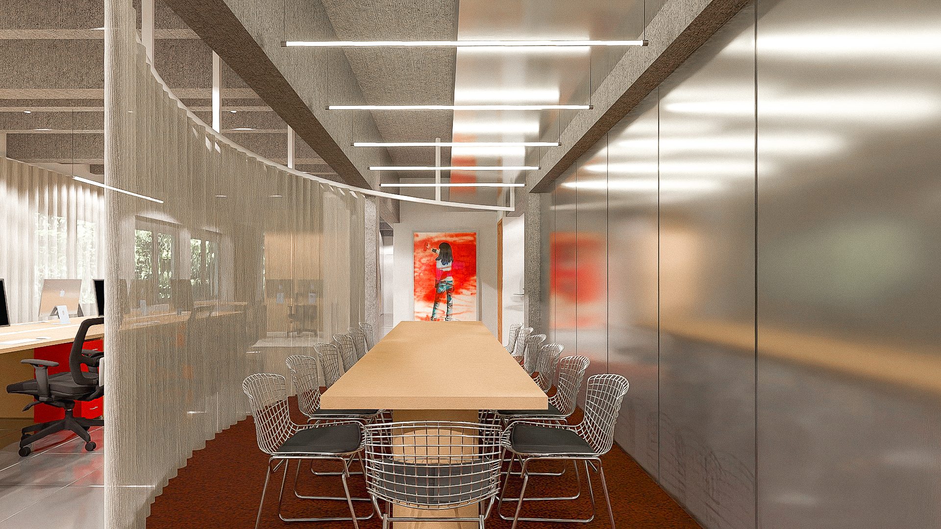 Within the large open space, we created a central zone — a multifunctional area for meetings, brainstorming sessions, and lunches. A generous creative table sits at the heart of it, framed by a curved curtain that can be drawn or opened depending on the need, offering flexibility without closing off the space.