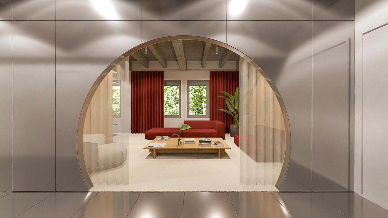 From the very first visit, one idea stood out — a large aluminum arch. A bold architectural gesture, designed as a gateway into the agency’s universe, and a visual statement in a space with constant movement of clients and collaborators.