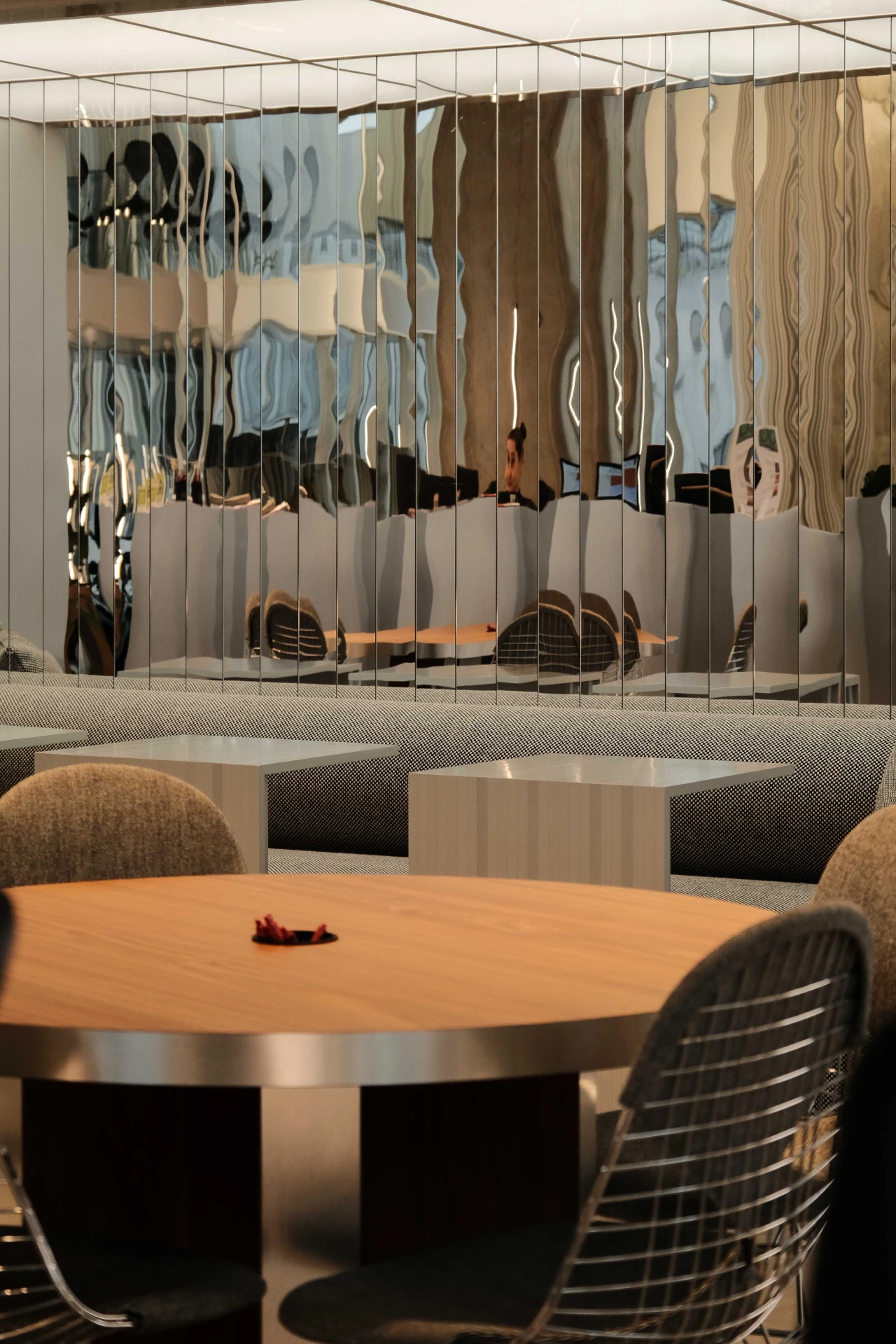 The tones can be described as different shades of grey: Concrete flooring combined with sleek brushed aluminium walls. An organizational light cage guides you from the entrance to the office spaces and splashes of colour and materials, such as full cork offices, stand out.