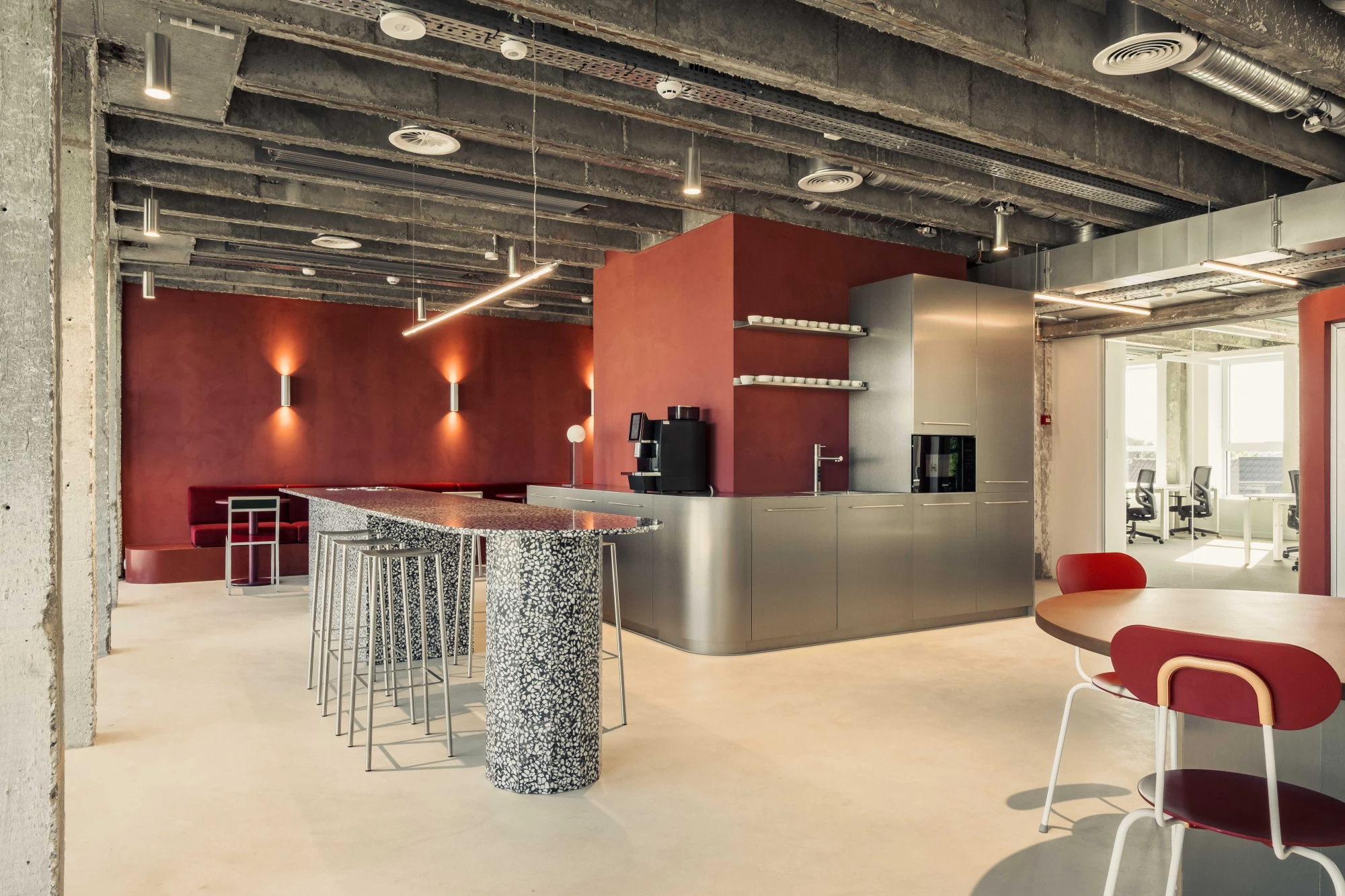 The private offices offer seclusion for focused work, each adorned with minimalist design elements that/to foster productivity and creativity. The open space collects all communal functions: phonebooths, flex desking, coffee corners and lunch corners. For formal gatherings, the intimist meeting rooms provide sophisticated aesthetics and warmth.